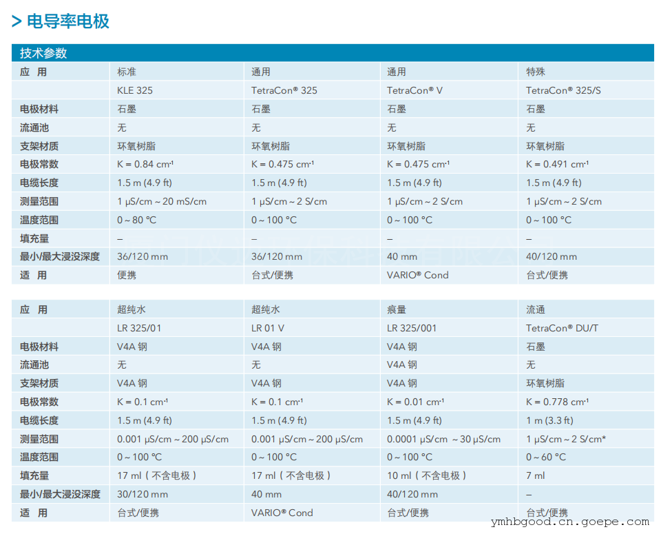 一、TetraCon 325电导电极技术参数电极 极数 4 感测极材质 石墨 电极杆材质 环氧树脂,黑色 尺寸 杆直径 15.3mm 杆长 120mm 接头直径 21.7mm 电极总长 162.5mm 电缆长 1.5m(电缆可更换) 浸入深度 - *小:36mm
